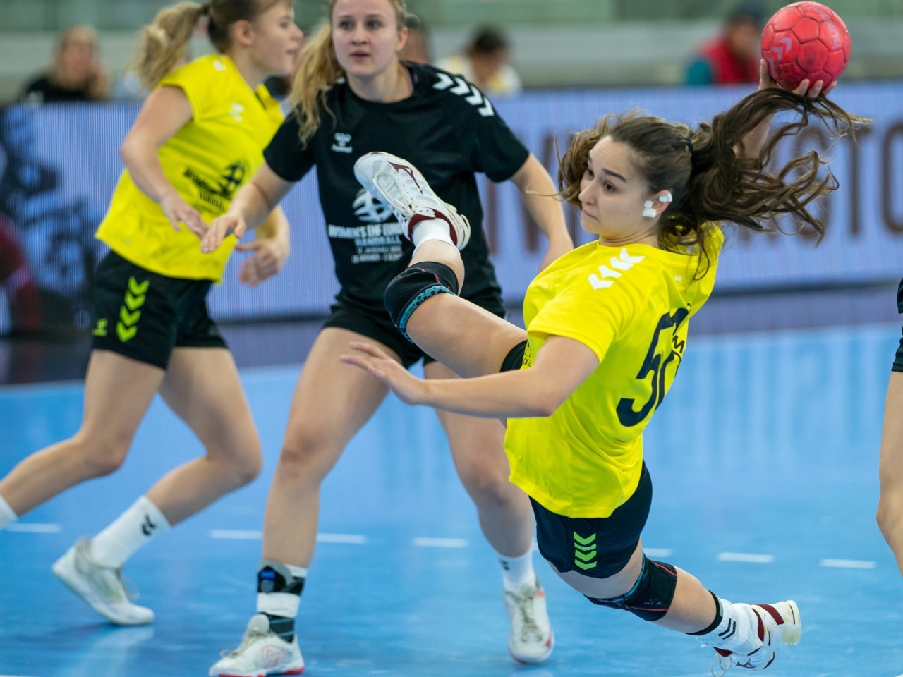 Das Torwandschiessen erweist sich offensichtlich auch für gestandene Handballerinnen als echte Herausforderung. Mina Vasic trifft als einzige und erspielt dem Yellow SPL Team den Sieg um das Anspiel des Women's EHF Euro Promotion Game.